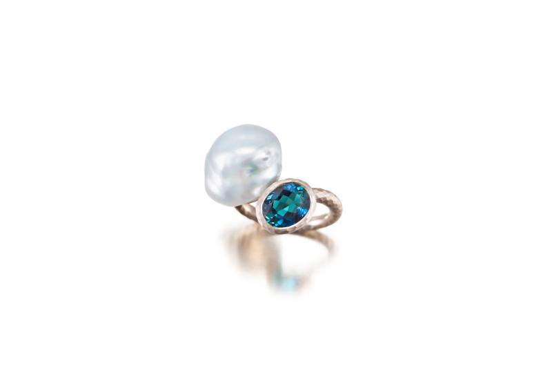 En barockformad söderhavspärla ger en härlig kontrast till den mörka indigoliten. När vi ännu lägger till hamrad vitguld blir helheten oslagbar.